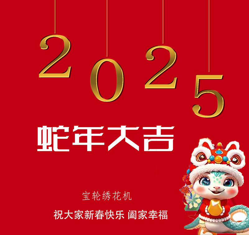 尊敬的客戶:辭舊迎新,春節(jié)來臨之際,根據(jù)相關(guān)規(guī)定,結(jié)合我司實際情況,為便于及早合理地安排節(jié)假日有關(guān)工作,現(xiàn)將我司2025年春節(jié)放假安排告知如下:1.放假時間:2025年01月22日-2025年02月05日,共放假15天2.節(jié)后上班時間:02月06日放假期間只接單不發(fā)貨,為此給大家?guī)聿槐悖凑堃娬?再次感謝大家的支持與配合。預(yù)祝大家:新年快樂!闔家幸福!生意興降!東莞市寶輪電腦刺繡機械有限公司2025年01月21日.......